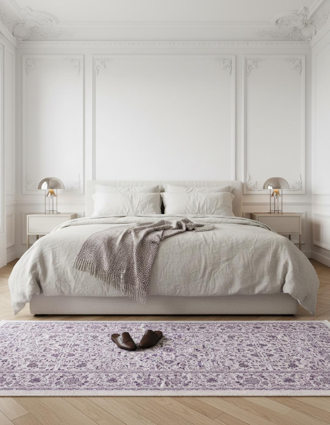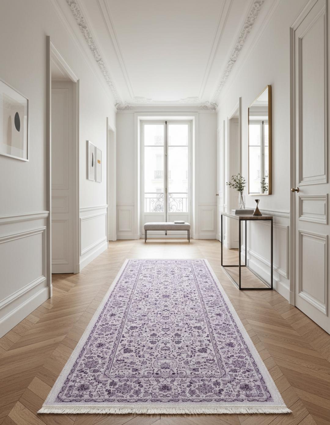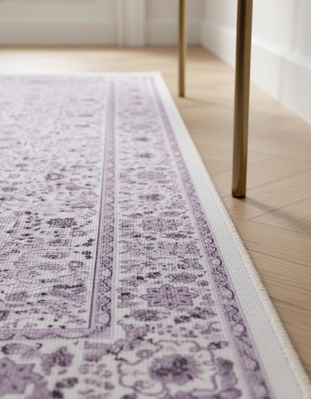 En parcourant la surface, on perçoit l'effet "distressed" qui travaille les motifs, offrant une profondeur visuelle où les ombres et les zones éclairées dialoguent. Les tons passés du violet modulent la lumière ambiante, la rendant plus douce, plus intime ; ils tempèrent les contrastes et instaurent une atmosphère propice à la lecture ou à la lenteur d'un salon. Le caractère décoratif demeure fort : géométries anciennes et frises altérées cohabitent pour créer une pièce maîtresse capable de transformer une chambre, un coin lecture ou une entrée en un écrin chaleureux.