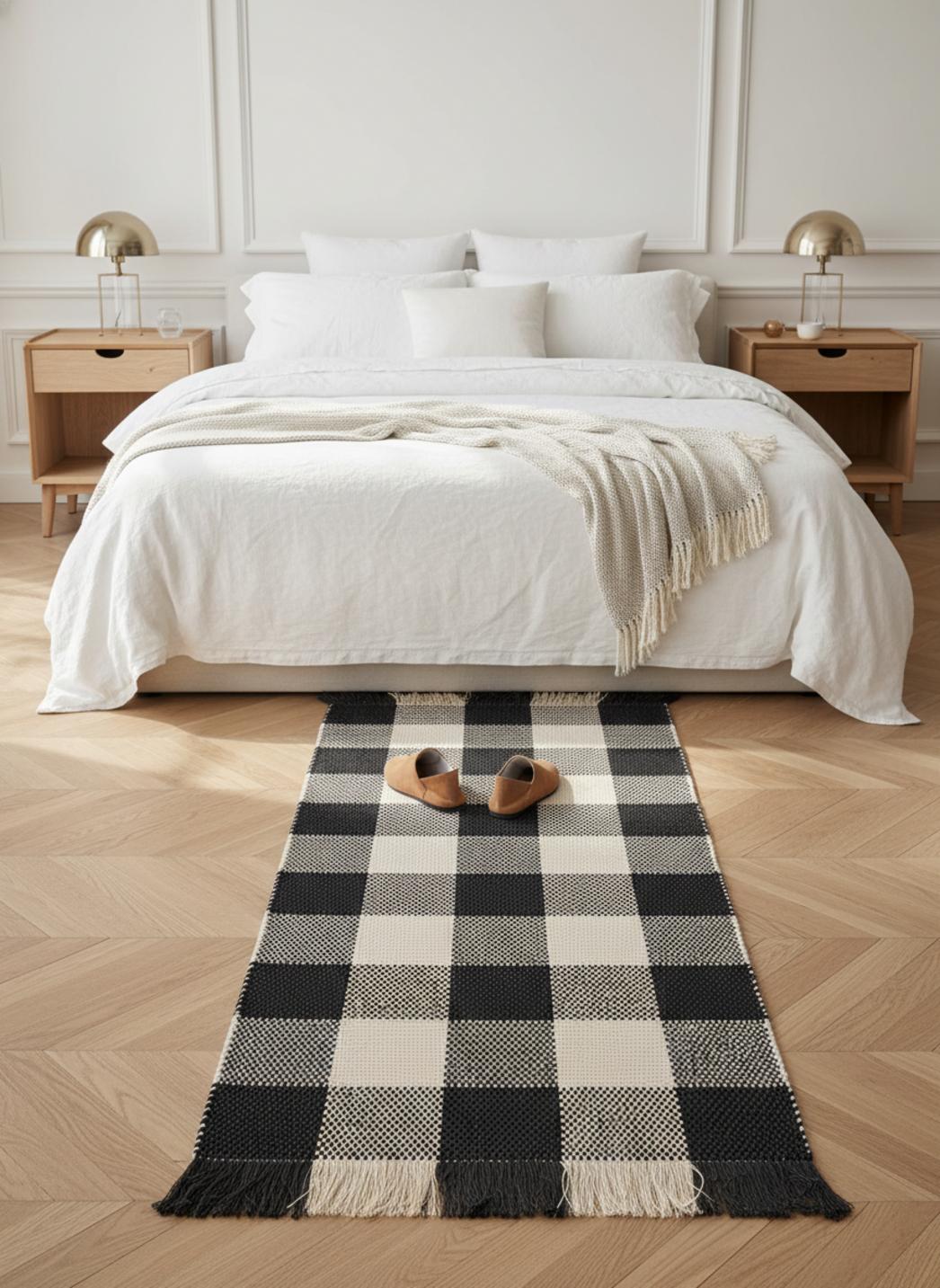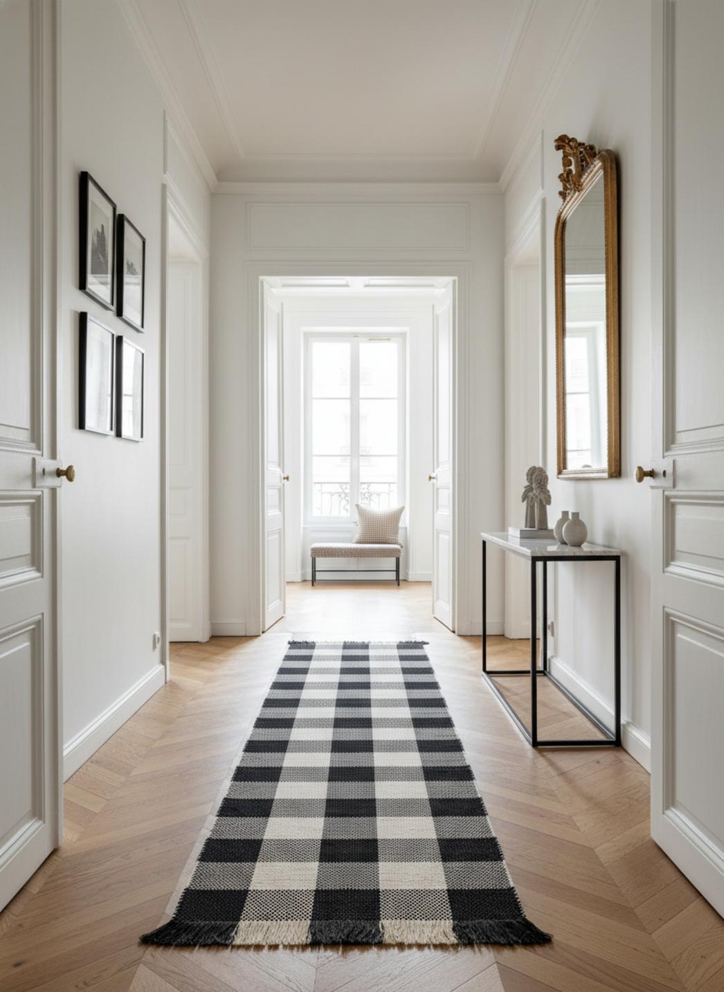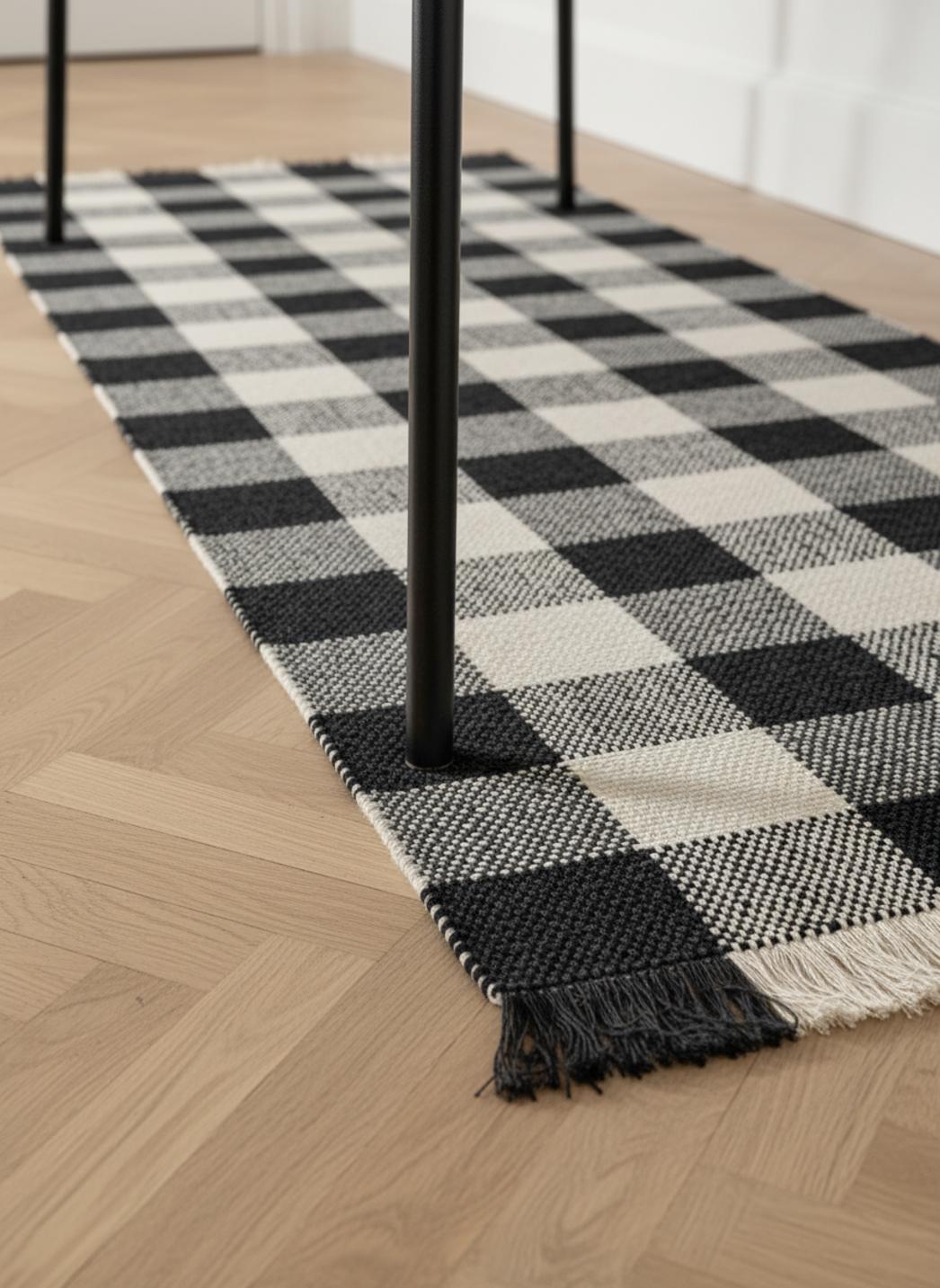 Tapis vintage trame tartan de couloir noir et blanc en coton 70x200 cm